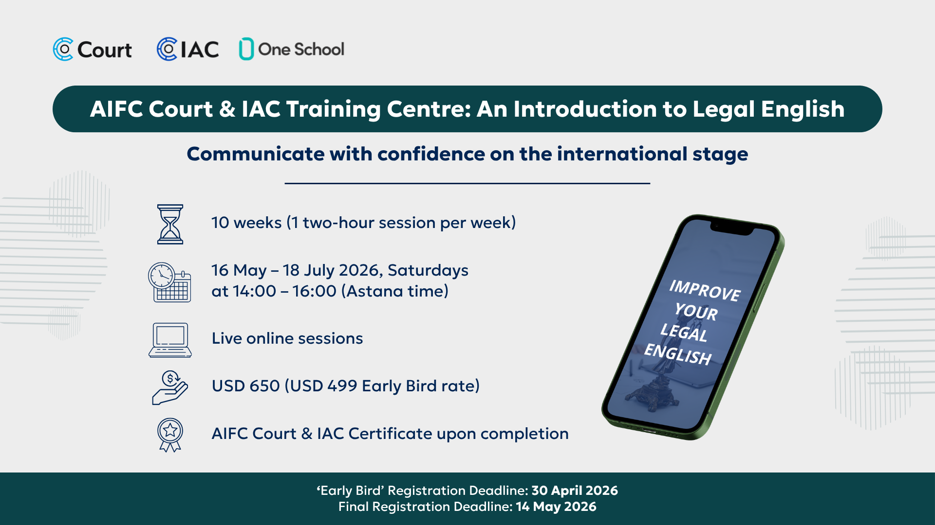 The AIFC Court & IAC Training Centre, in collaboration with One School, will provide a practical, live online English language course, "An Introduction to Legal English", designed for legal professionals, law students, and anyone working in international legal environments.