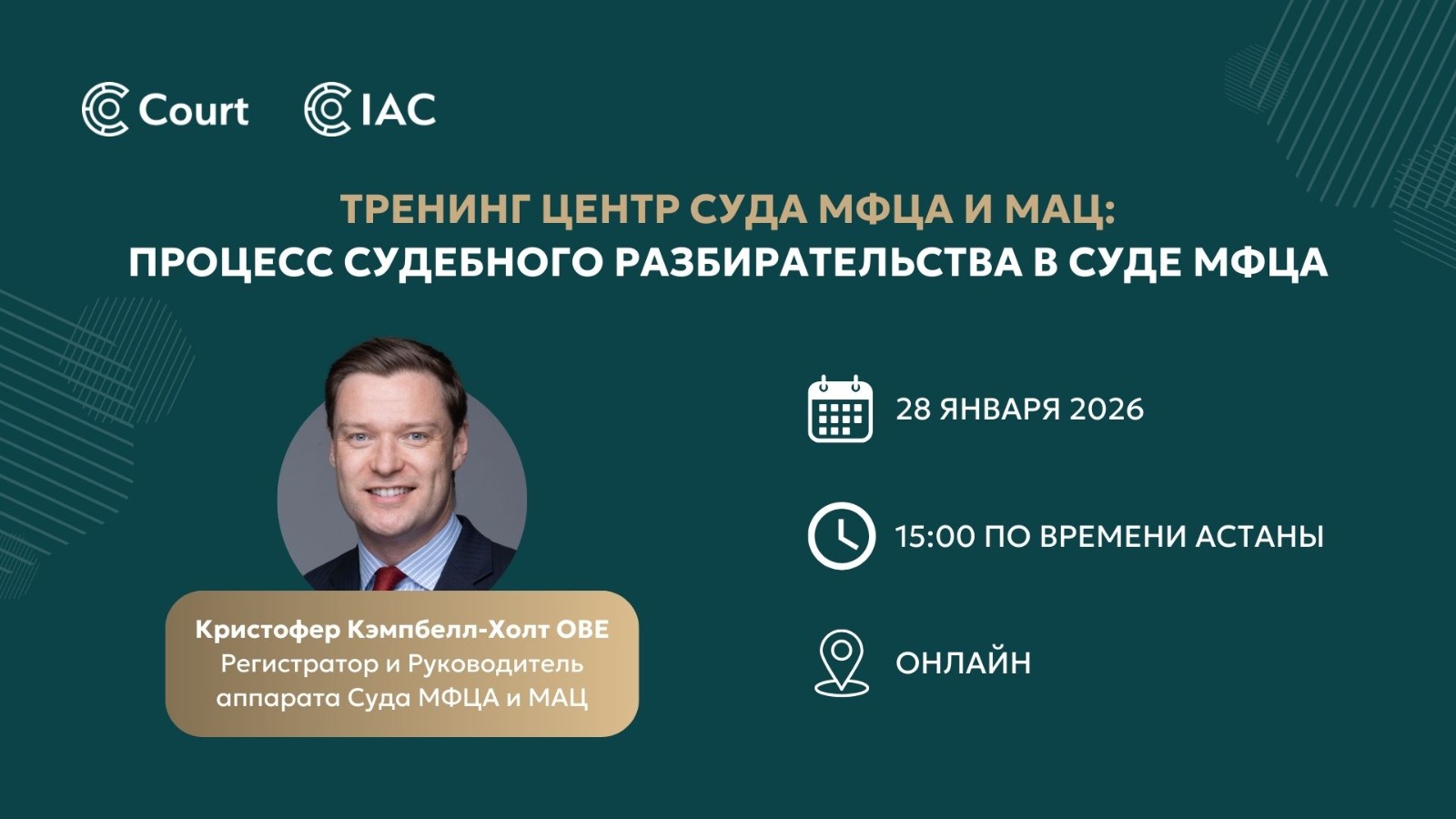 Тренинг центр рад пригласить участников на онлайн-тренинг «Процесс судебного разбирательства в Суде МФЦА», который проведет Кристофер Кэмпбелл-Холт OBE, Регистратор и руководитель аппарата Суда МФЦА и МАЦ, 28 января 2026 года в 15:00 по времени Астаны.